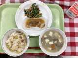 献立は 「中華丼、春雨サラダ、豆腐スープ、牛乳」です。 世中研、2学期末考...