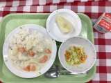 献立は 「シナモン揚げパン、肉団子入り春雨スープ、ポテト入りフレンチサラダ、牛乳...