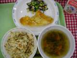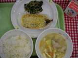 献立は 「麦ごはん、魚のステーキソース、コーンサラダ、ポテトスープ、牛乳」です。...