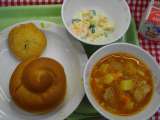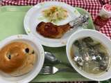 献立は 「ぶどうパン、ローストチキン、コールスローサラダ、白菜のスープ、ジョア」...