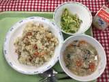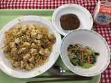 献立は 「炒飯、中華サラダ、ワンタンスープ、牛乳」です。 今日の炒飯は、...