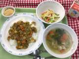 献立は 「ひよこ豆のカレーライス、らっきょうサラダ、野菜スープ、黒蜜寒天、牛乳」...