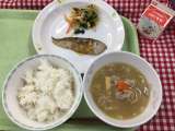 献立は 「豚肉と牛蒡のごはん、鯖のカレー揚げ、磯香和え、白菜の味噌汁、牛乳」です...