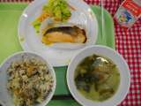 献立は 「ひじきごはん、鮭の梅マヨネーズ焼き、切干大根のサラダ、なめこの味噌汁、...