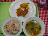 献立は 「お赤飯、鶏肉の唐揚げ、野菜の辛子和え、牛乳」です。 今日は、3年...