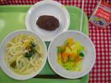 献立は 「鶏塩うどん、パリパリサラダ、牡丹餅、牛乳」です。 今日は、気温が上...
