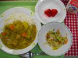 献立は 「チキンカレーライス、こんにゃくサラダ、苺、牛乳」です。 令和3年度...