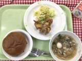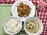 今日は、1年生のリクエスト献立です。 献立は 「チョコチップパン、鶏肉の唐揚げ...