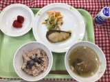 献立は 「お赤飯、鰤の照り焼き、野菜の辛子醤油和え、沢煮碗、苺、ジョア」です。 ...
