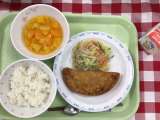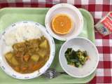 献立は 「ポークカレーライス、春キャベツとわかめのサラダ、清見タンゴール、牛乳」...