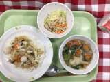 献立は 「中華丼、キャベツとツナのサラダ、ワンタンスープ、牛乳」です。 お日様...