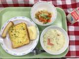 献立は 「卵トースト、パリパリたっぷりサラダ、コーンシチュー、りんご、牛乳」です...