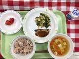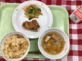 献立は 「塩尻キムタクごはん、山賊焼き、糸寒天と野菜の和え物、厚揚げスープ、牛乳...