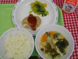 献立は 「ごはん、ふりかけ、春野菜の旨煮、大豆とじゃこの甘辛揚げ、牛乳」です。 ...