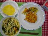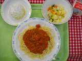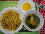 献立は 「スパゲティミートソース、マセドアンサラダ、米粉抹茶ケーキ、牛乳」です。...