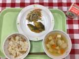献立は 「筍ごはん、鯖のカレー揚げ、野菜のごま酢かけ、豆腐汁」です。 今日は、...
