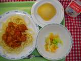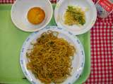 献立は 「スパゲティ地中海ソース、野菜のレモン醤油かけ、黒砂糖入り蒸しパン、牛乳...