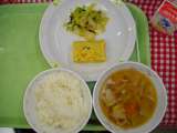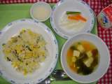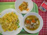 献立は 「青菜の炒飯、ピクルス、豆腐とわかめのスープ、杏仁豆腐、牛乳」です。 ...