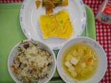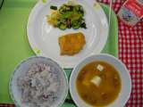 献立は 「とうきびごはん、鮭のチャンチャン焼き、大豆とじゃこの甘辛揚げ、つぼっこ...