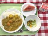 献立は 「チキンカレーライス、野菜の甘酢漬け、小玉西瓜、牛乳」です。 お昼...