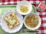 献立は 「ツナコーンチーズトースト、白いんげん豆の田舎風スープ、カレドレサラダ、...