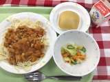 献立は 「スパゲティ地中海ソース、野菜のレモン醤油和え、黒砂糖入り蒸しパン、牛乳...