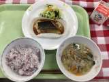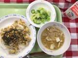 献立は 「ゆかりごはん、鯖の生姜風味焼き、春野菜とわかめのサラダ、白菜のスープ、...
