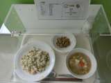 献立 高菜めし・豚汁・さつま芋と大豆の絡め煮・牛乳 産地 米・・・・・・茨城県...