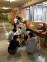 二部制の授業、消毒作業が終わり、いよいよ入学式の準備をしています。写真は舞台の看...