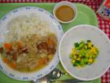 献立は 「カレーうどん、和風サラダ、コーン入り蒸しパン、牛乳」です。 今朝は...