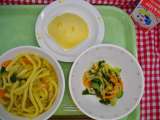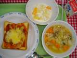 献立は 「ピザトースト、白いんげん豆の田舎風スープ、フルーツヨーグルト、牛乳」で...