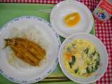 献立は 「鰯の蒲焼き丼、にらたまスープ、バレンシアオレンジ、牛乳」です。 6...