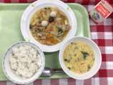 献立は 「豚キムチ丼、大豆とじゃこの甘辛揚げ、豆腐スープ、牛乳」です。 雨...