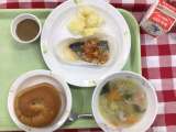 献立は 「黒砂糖パン、鯵のエスカベージュ、粉ふき芋、ベーコンと白菜のスープ、カフ...