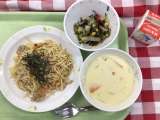 献立は 「和風スパゲティ、大根とひじきのサラダ、コーンチャウダー、牛乳」です。 ...