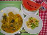 献立は 「夏野菜のカレーライス、、梅ドレサラダ、小玉西瓜、牛乳」です。 今日...