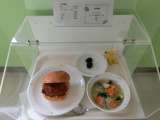 献立 コロッケサンド・ベーコンと野菜のスープ煮・巨峰・牛乳 主な食材の産地 豚...