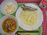 献立は 「肉野菜つけうどん、ししゃもの唐揚げ、フルーツヨーグルト、牛乳」の予定で...