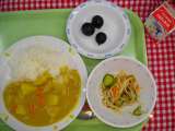 献立は 「ココナツチキンカレー、こんにゃくサラダ、巨峰、牛乳」です。 今日の...