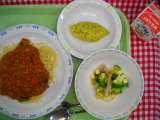 献立は 「なすとしめじのボロネーゼ、バジルサラダ、スイートポテト、牛乳」です。 ...