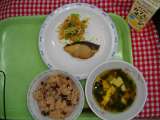 献立は 「お赤飯、鰤の照り焼き、野菜の胡麻和え、澄まし汁、牛乳」です。 今日...
