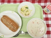 献立は「チリビーンズドッグ、マカロニサラダ、クリームシチュー、牛乳」です。優しい味のチリビーンズを柔らかいコッペパンに挟んでいただきました。*食材産地***豚挽肉・・・群馬県豚肝臓・・・群馬県玉葱・・...