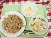 献立は「五目焼きそば、にらたまスープ、フルーツヨーグルト、牛乳」です。メニュー名の「五目」の名の通り、様々な食材を使った焼きそばは、それぞれの食材の旨味の相乗効果が現れたひと品でした。*食材産地***...