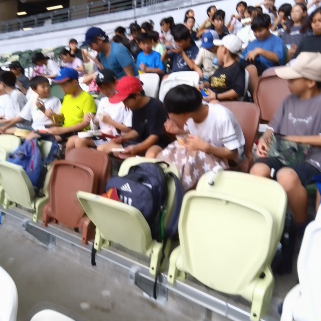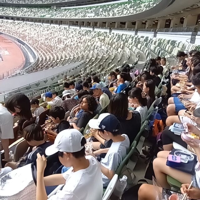 スタジアム内の見学、記念撮影が終わり、観客席に座ってお弁当を食べました。眼の前に広がる雄大なスタジアムを見ながら、美味しくいただきました。9月には、このスタジアムで世界陸上が行われます。200の国々からアスリートが集まって熱戦が繰り広げられます。今からとても楽しみです。