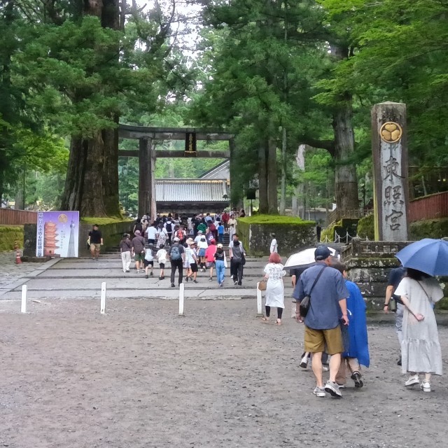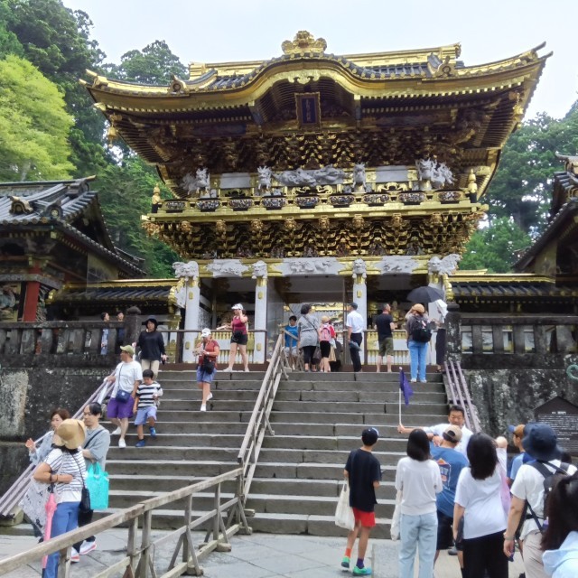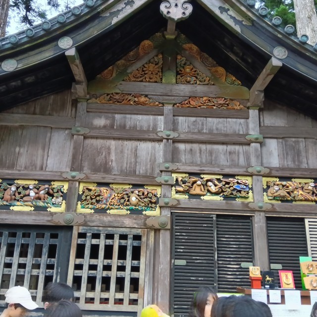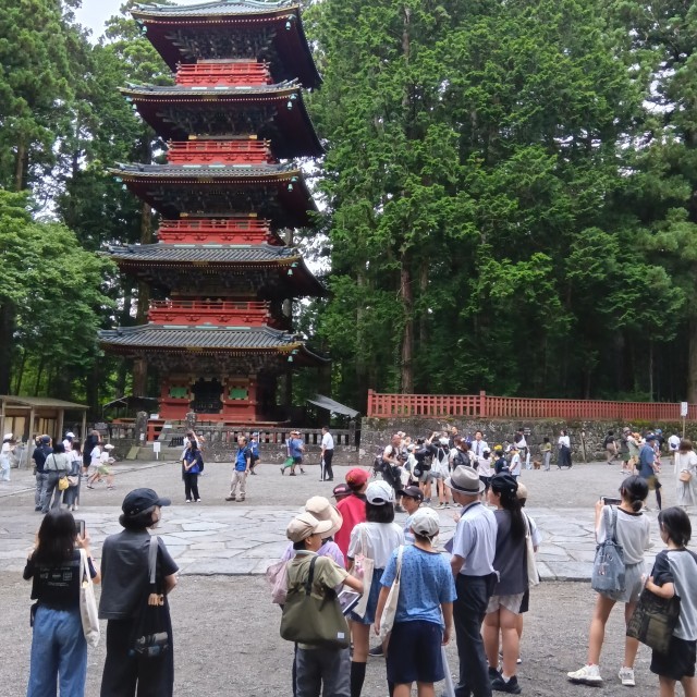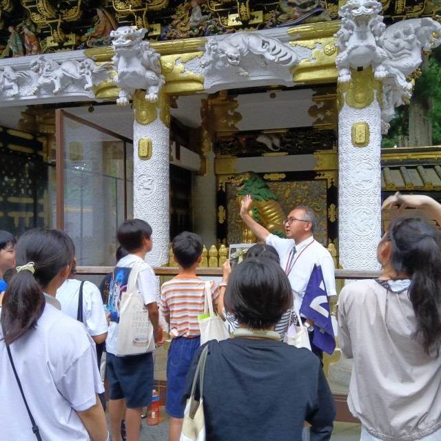 日光東照宮に着きました。東京スカイツリーと同じ高さの標高にあり、三猿や陽明門、眠り猫、鳴き龍なと、有名な歴史的建造物を見学しました。建造物は巧みな技術が施され、子ども達も感嘆の声をもらしていました。