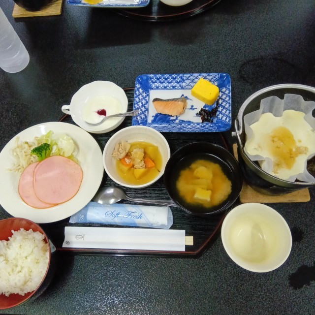 2日目の朝食は、メニューに手づくり豆腐がありました。普段食べている豆腐より、味が濃いように感じました。天気もよく、絶好のハイキング日和です。