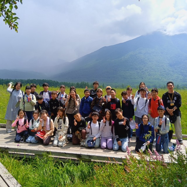 男体山をバックに、クラスの記念写真を撮りました。みんないい笑顔です。美味しい空気をたくさん吸って、自然を満喫しました。