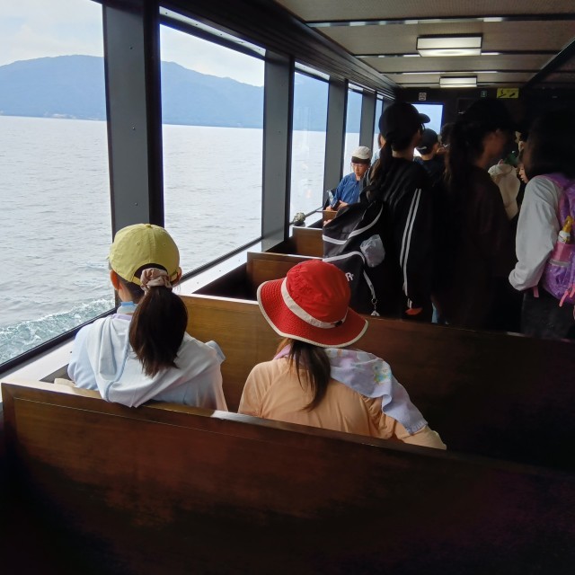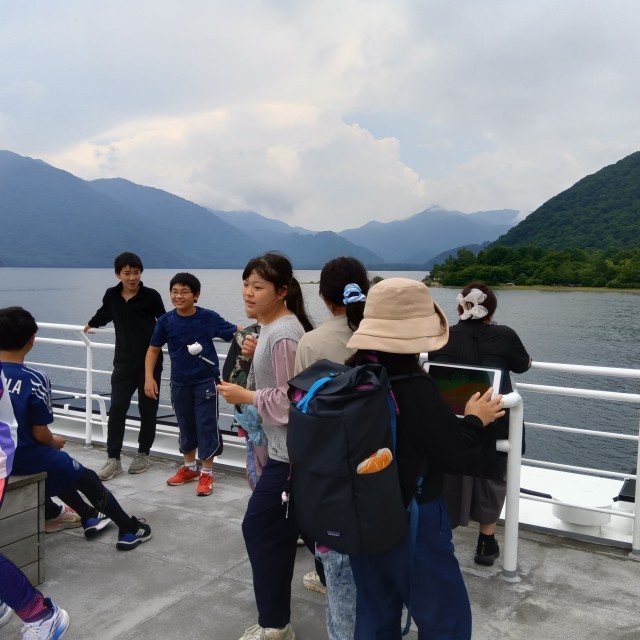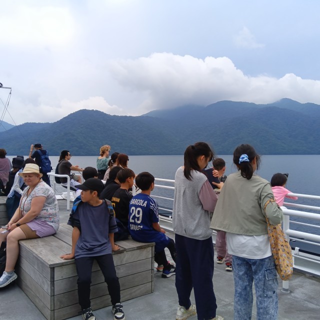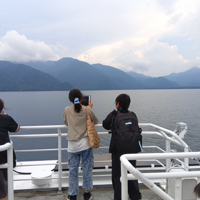 午後は、魚と森の観察園に行く予定でしたが、昨日、観察園の施設内で熊の目撃情報があったため、竜頭の滝見学に変更しました。日光三大名瀑の一つで、滝の姿が竜の頭に似ていることから名付けられました。湯滝同様に迫力満点の滝でした。その後は、中禅寺湖遊覧です。遊覧船に乗って、日本百景に選定されている湖をゆっくり眺めました。