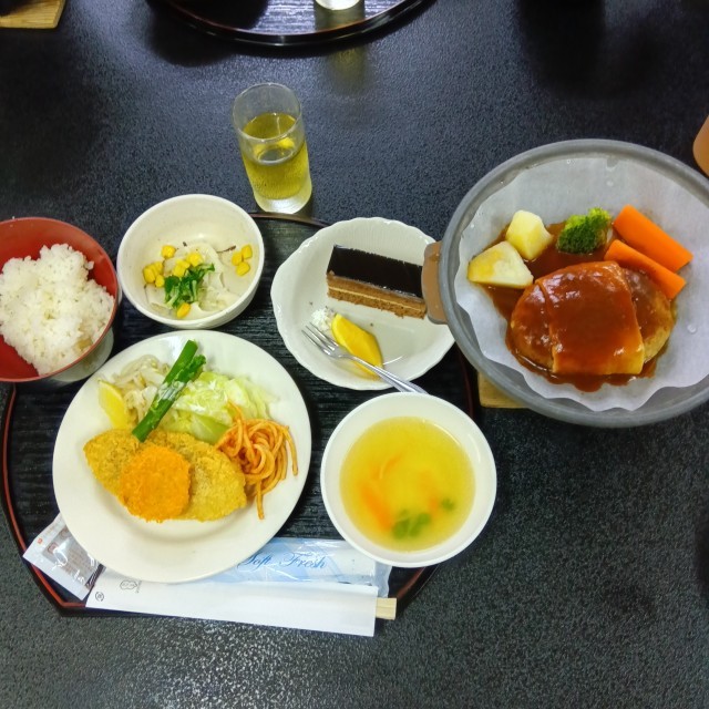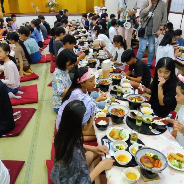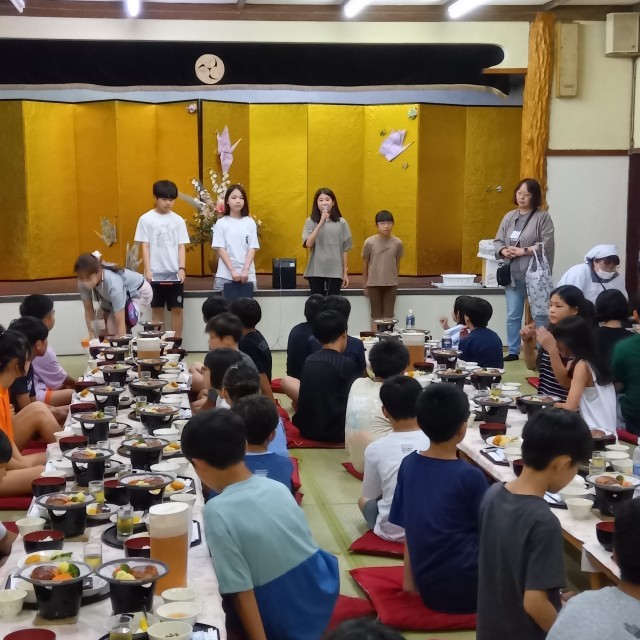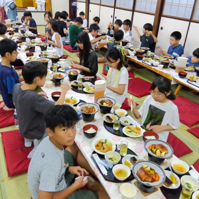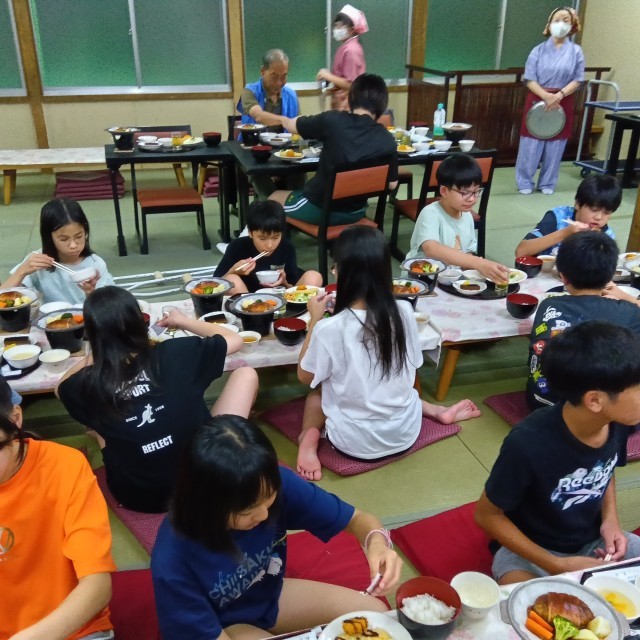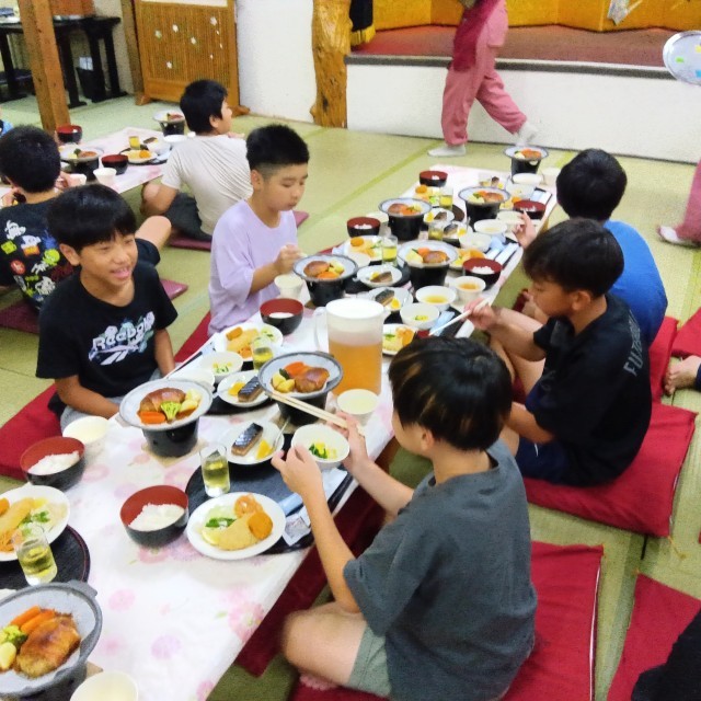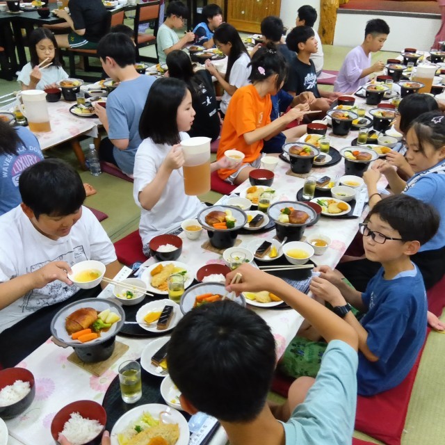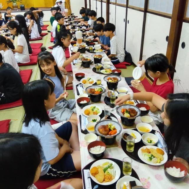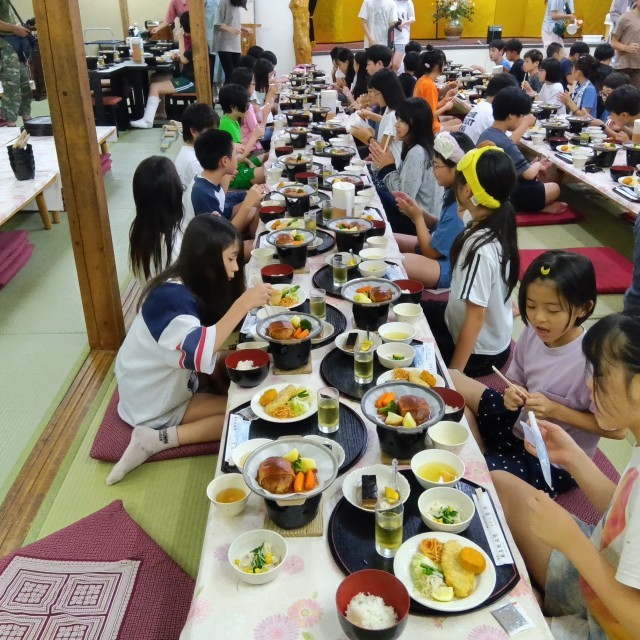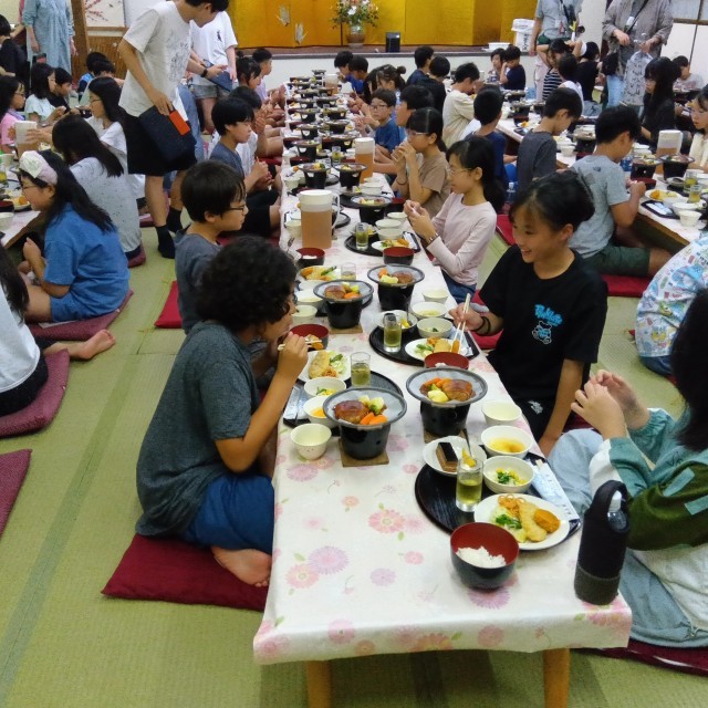 日光最後の夕食です。子ども達が大好きなハンバーグがメインのメニューでした。友達と一緒に食事をするのが楽しいようで、会話に花が咲いています。夕刻になるにつれ、雨雲が立ちこめ、雷も鳴るようになりました。残念ですが、キャンプファイヤーは中止で室内レクリエーションを、これから大広間で行います。