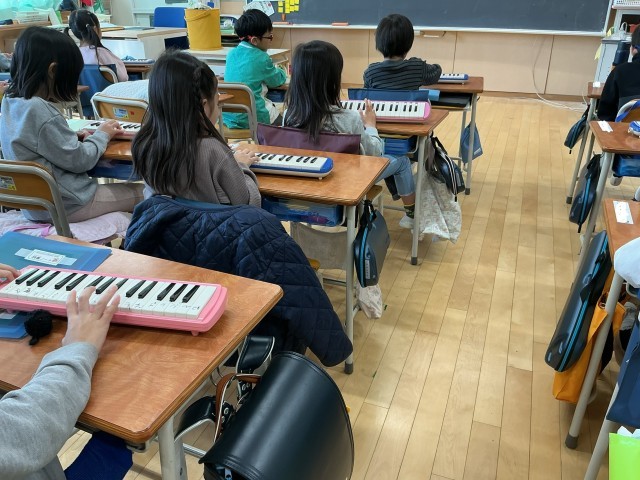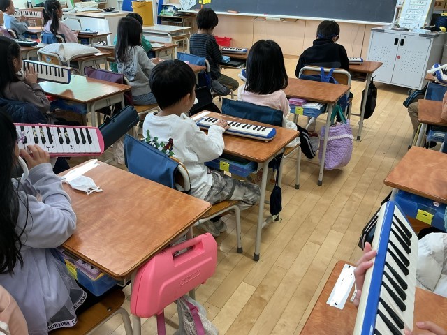 一年生は鍵盤ハーモニカでこいぬのマーチを練習しています。